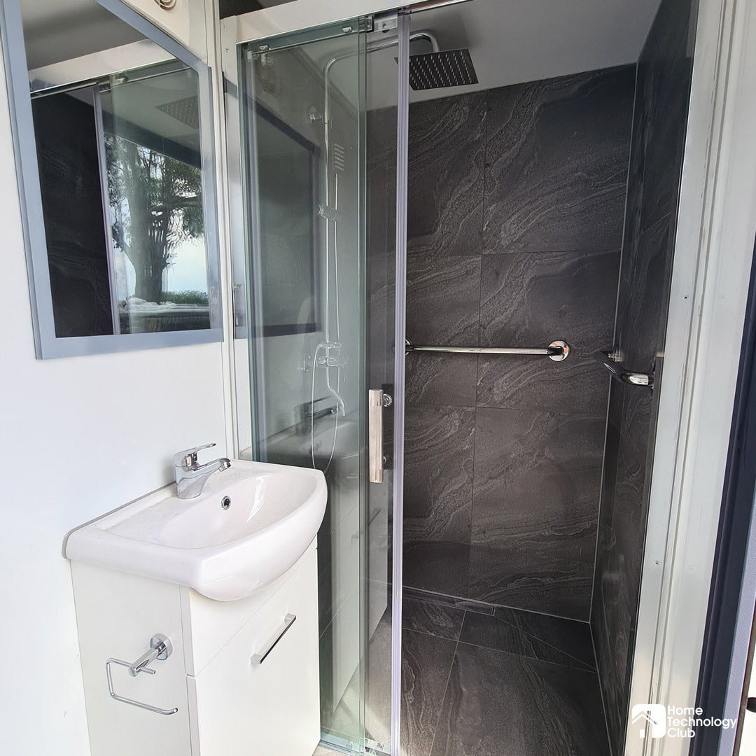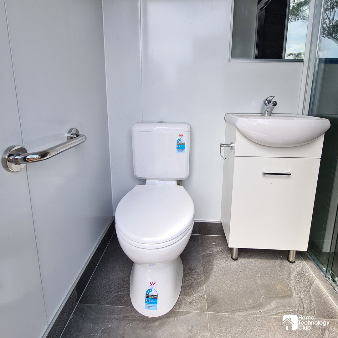 Change what you think of site toilet and shower units with our spacious, fully tiled portable bathroom, built in NSW by licensed builders, tilers, electricians and plumbers. Models are complete with ceramic toilet and bathroom vanity, mirror, grab rails, and sliding glass door shower with rainfall and handheld shower heads.